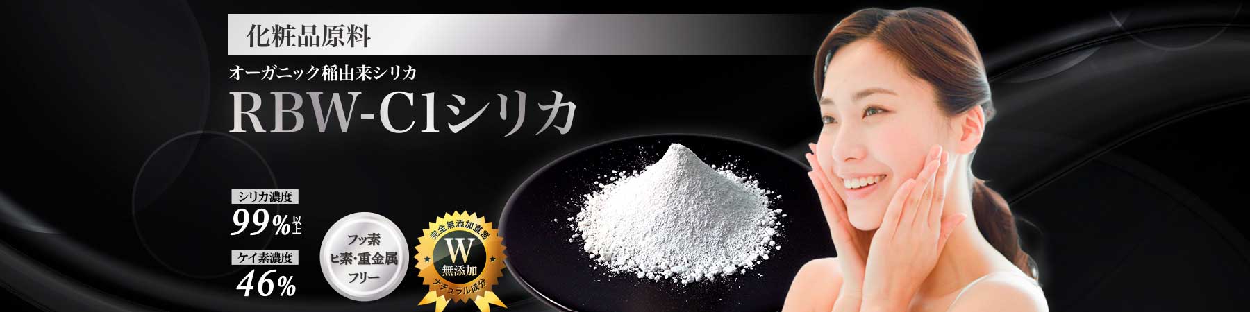 天然由来・植物性の化粧・美容品原料を取り扱います。とりわけ、オーガニック稲由来ケイ素パウダー「RBW-C1シリカ」は、通常の化学合成のシリカとは違い、天然植物性現ケイ素原料として大きな注目を集めています。